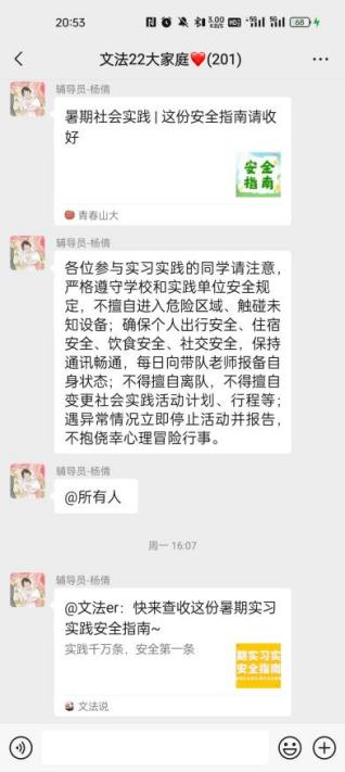 辅导员于年级群内发布社会实践安全提示