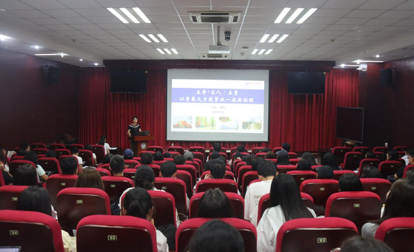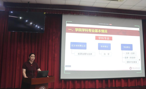 研究生教学秘书郭静随后发言,她以清晰的逻辑、详实的内容,为同学们介绍了三年的培养流程。从课程设置、选课方法、学业考核到论文开题、答辩环节,她逐一进行讲解,并结合往届同学的实际情况进行经验分享。她提醒新生们要科学规划学业进程,避免“临时抱佛脚”,鼓励大家在学习过程中多与导师沟通,充分利用学院提供的课程与学术资源。她的发言既宏观全面,又细致入微,为同学们明确了学习路径。
